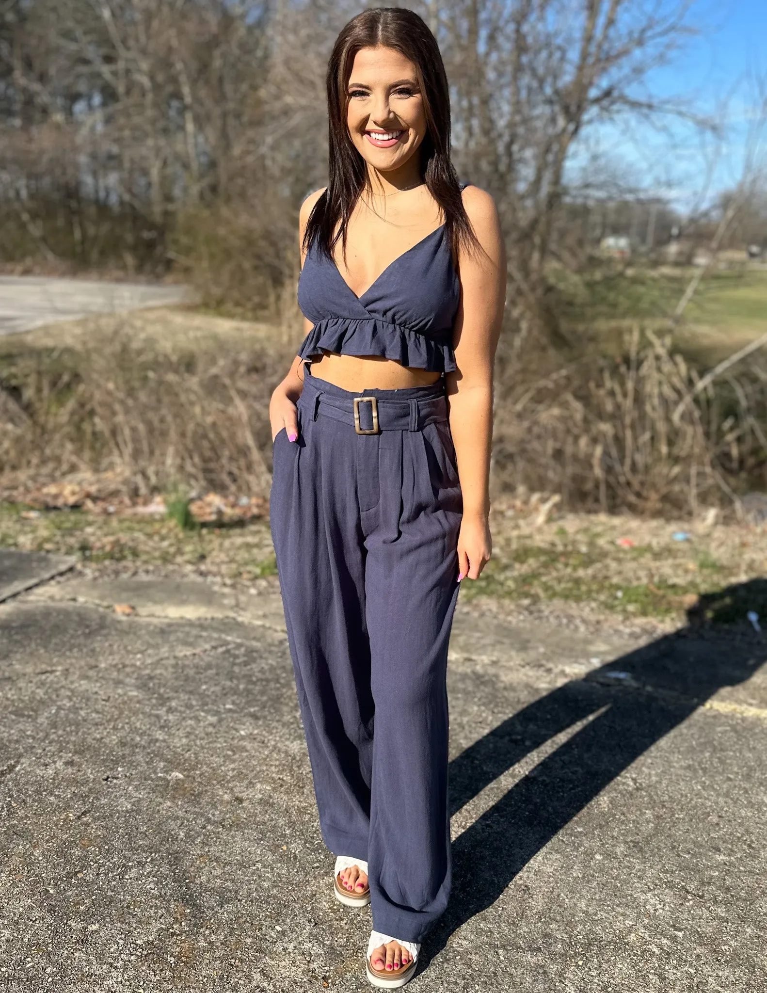 self tie detail and matching belted paper bag straight left pants set. Pants have
