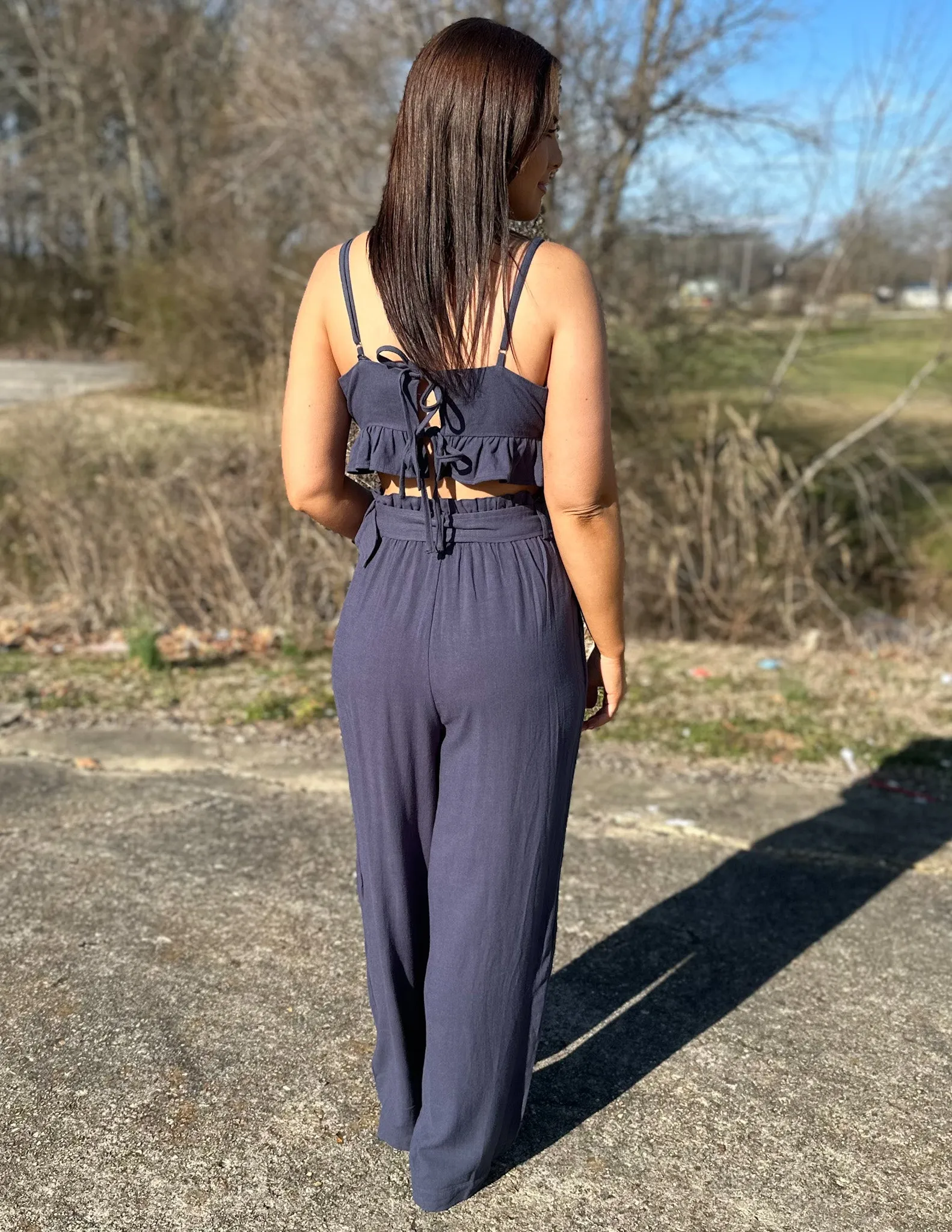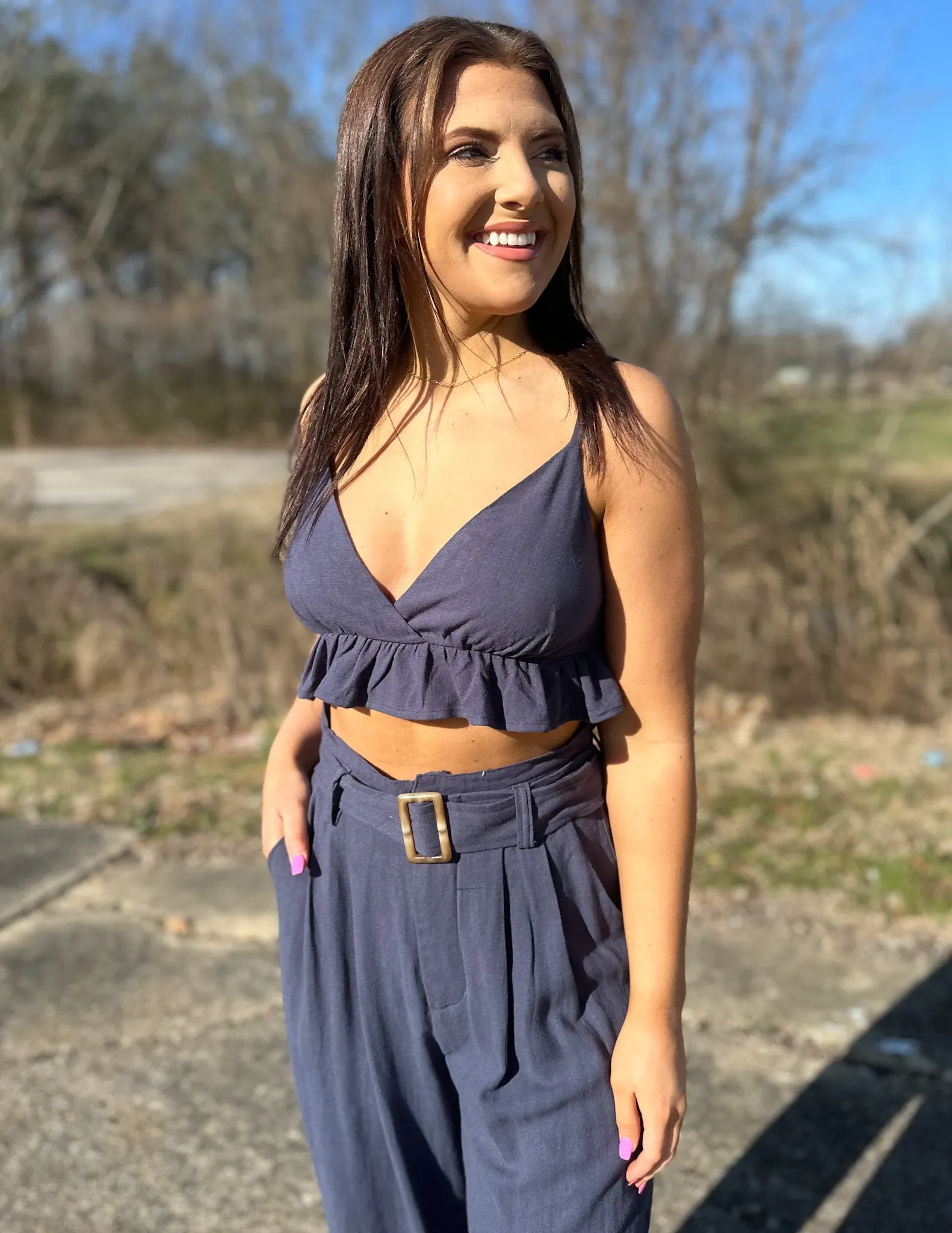 Viscose linen adjustable spaghetti strap ruffle hem cami crop top with open back